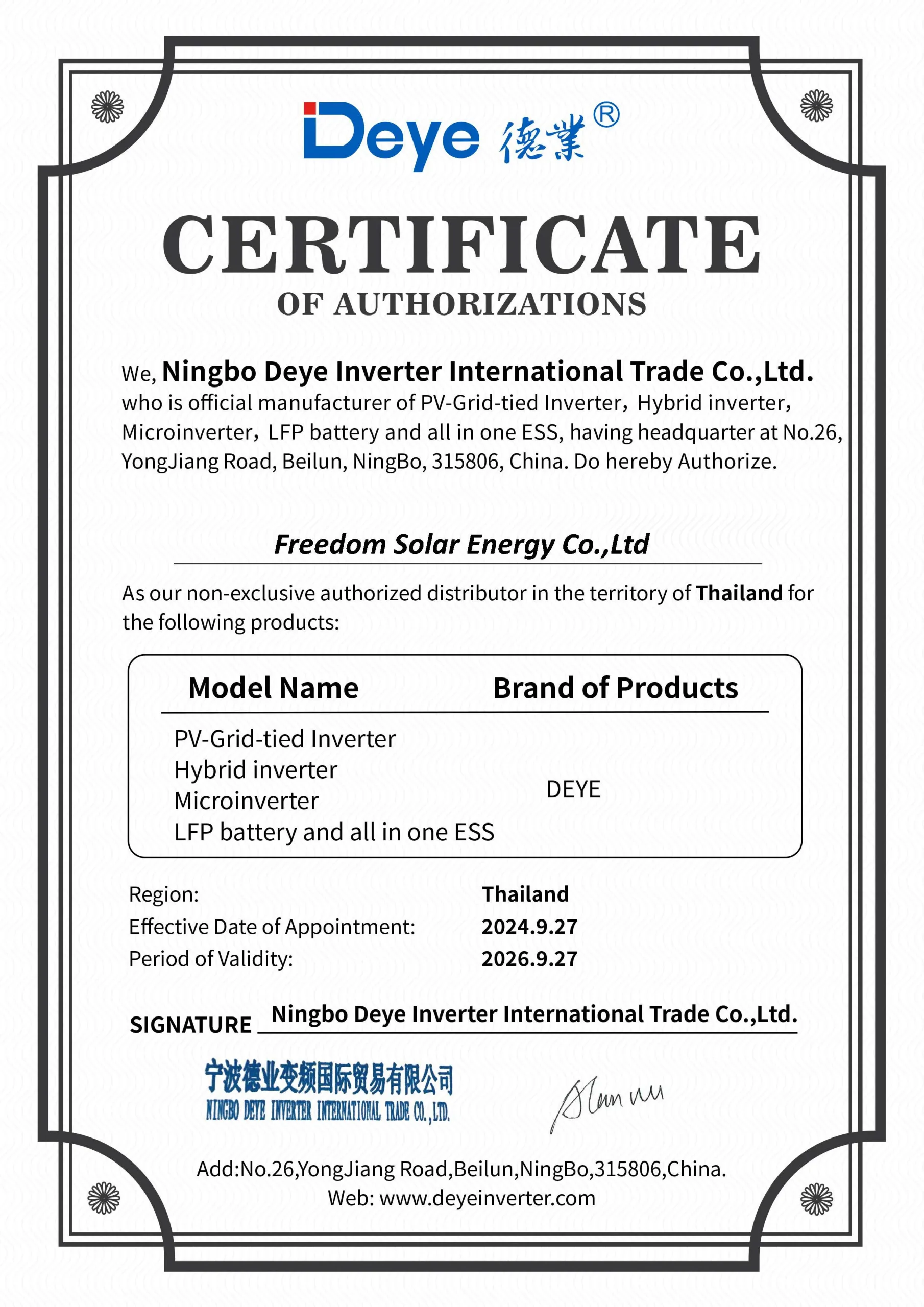 บริษัทได้รับการแต่งตั้งอย่างเป็นทางการจาก DEYE ผู้ผลิตอินเวอร์เตอร์และระบบกักเก็บพลังงานชั้นนำ ให้เป็นตัวแทนจำหน่ายในประเทศไทย สะท้อนถึงความน่าเชื่อถือ มาตรฐานสินค้า และความเชี่ยวชาญด้านระบบโซล่าเซลล์ที่ลูกค้าวางใจได้